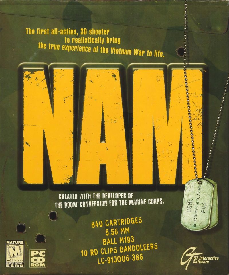 The year is 1966, shortly after USA deployed its troops to participate in the Vietnam War. Alan "The Bear" Westmoreland, a Marine Corps sergeant, is sent behind the enemy lines. He is known for his high endurance, achieved by ingesting various stimulants. As long as these drugs keep him going, the Bear isn't afraid of danger, and is used by his superiors for missions with overwhelming odds. The raid turns into total warfare, with only a small team at his side, the Sergeant will have to do everything he is capable of in order to survive.NAM is a military-themed first-person shooter that uses the Build engine. The protagonist has to fight his way through the jungle, with various weapons such as M16, M60, M79, LAW, and others. The missions range from urban gun battles to sneaking in the thick jungles and man-made tunnels under the ground. The battlefields are frequented by air strikes, anti-personnel mines (which the player can spot with a mine detector), fire fights, ambushes, snipers and tanks. Fellow soldiers will aid Alan in battle, though for the most part he'll have to depend on himself.A multiplayer battle is included, featuring 19 multiplayer levels with different game modes like Gruntmatch, Capture-the-flag and Fireteam, where each player is allowed to select a soldier type and is sent on different missions.