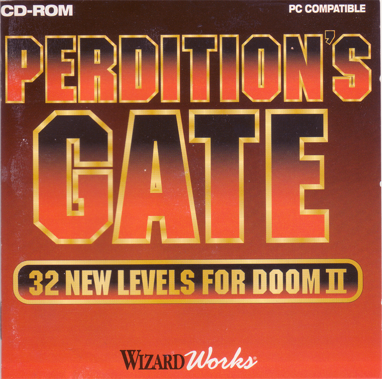 Perdition's Gate is an unofficial commercial add-on for DOOM II. It replaces all 32 original levels and features some new music and textures.There are no gameplay changes, new monsters or weapons, it is just a level set. It contains a new plot, changing the demons into an alien race from the planet Hell. The new plot is told through a readme file included with the game and short pieces of text on every map's intermission screen, which replace the level name graphics. However, because Perdition's Gate is simply a level set, the original DOOM II plot screens still appear after some maps.
