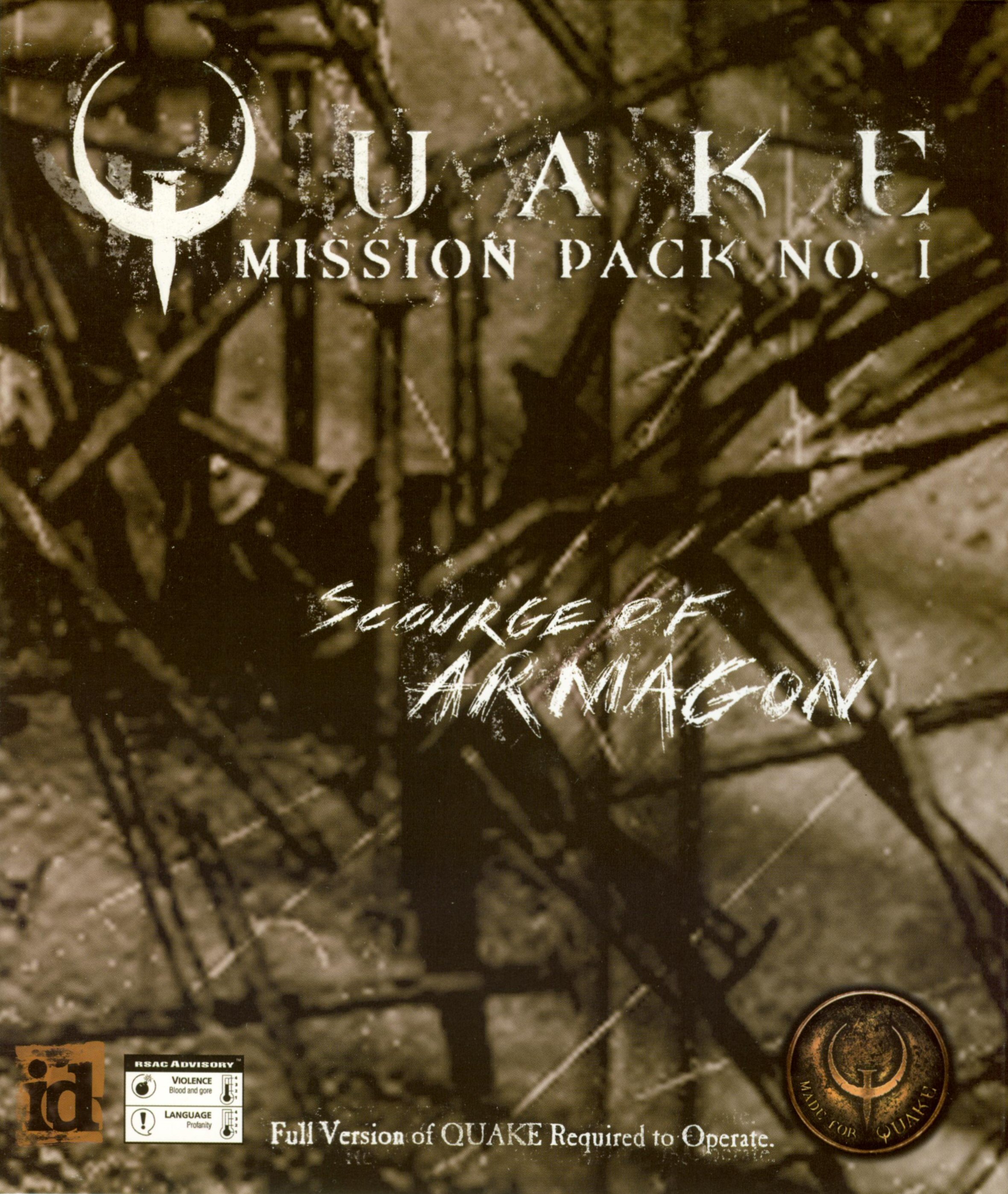 Shub-Niggurath and her minions have been defeated, but that doesn't mean that Quake's forces are finished. Arriving back at home base, you find it overrun with more of the hellish creatures. Armagon, another one of Quake's lieutenants, wants to continue where Shub-Niggurath failed. It's up to you to stop Quake once more.Scourge of Armagon is the first official mission pack for Quake. It contains 15 new single-player levels spread over three episodes, a new deathmatch level, and new monsters, weapons and power-ups.There are two new monsters: The Centroid is a huge mechanical scorpion who uses his sting for close attacks and two nail guns implanted in his claws for firing from afar. The Gremlin is a small and fast creature which can steal the player's weapon and use it against him.New weapons include the proximity mine launcher, which fires grenades that will attach themselves to walls, ceilings or floors. The grenades are motion-sensitive and are triggered when creatures walk near them. The laser cannon fires energy blasts, which can bounce off walls, possibly coming back at the player or hurting another enemy. The final new weapon is the Mjolnir, being the hammer of Thor. Running on energy cells, it sends out bolts of lightning at enemies when hammered on the floor.Among the new power-ups are the Empathy Shield, which gives some of the damage received by the player back to the attacker and the Horn of Conjuring, which summons a creature to fight by the player's side.