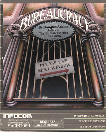 Bureaucracy is a text adventure game that describes the misadventures of a person who has recently moved to a new apartment and begins to fall victim to various bureaucratic procedures that always go wrong. He can't receive his mail, access his bank account, or generally lead a normal life; all his activities are impeded by needless and confusing hurdles. In order to retrieve the lost mail and put his life back on track, the protagonist will have to meet exotic characters and perform various tasks while being constantly threatened by various bureaucratic occurrences.