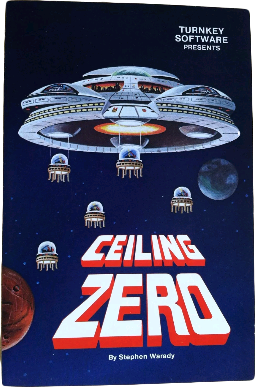 Ceiling Zero is a fixed screen shoot 'em up. It features an alien mothership that is protected by the titular ceiling, a power field that the player can't shoot through. The mothership throws various objects onto the screen that will bounce around until the player has shot them all down or he is killed when colliding with them. Once all the objects have been destroyed the ceiling moves down one step and another wave is released. The player's goal is to survive until the ceiling has reached the floor. There are three different kinds of objects and they differ, not only in appearance, but in their speed and how they move. In addition to these there is also occasionally a creature that attempts to land. If it succeeds before the player shoots it down, a life is lost no matter how far from the player it is. Similar to other early shooters the player is restricted to move left and right.