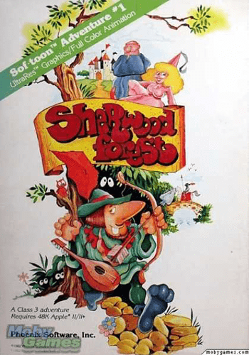 Sherwood Forest is an graphic adventure game with a text parser. You play Robin Hood and your goal is to marry Maid Marion. The regular Robin Hood cast makes an appearance: Little John, Friar Tuck, the Merry Men, and Sheriff of Nottingham. Your travels take you through forests, up mountains, into caves, and you even get to fly in an albeit unconventional way.