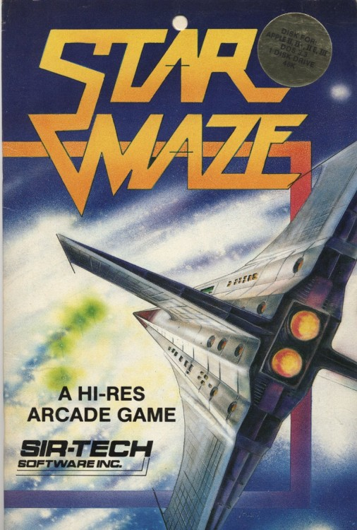 "Take a deep breath and let us transport you through hyperspace to STAR MAZE, a fast-paced arcade game distinguished by the classy Sir-tech touch. What makes STAR MAZE so different? A combination of special features. Like fantastic graphics. Full-screen , multidirectional scrolling . Brilliant colors. And much more.