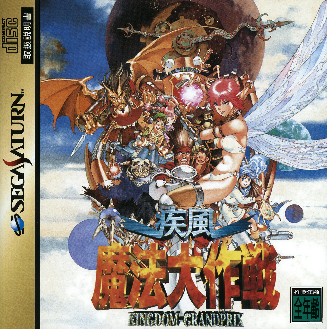 Shippuu Mahou Daisakusen or Kingdom Grandprix is a 2D arcade shooter and racing combination - a continuation of Sorcer Striker. The game has many fantasy creatures and futuristic vehicles. The player chooses 1 of 8 characters - all others are rivals in the race. Player moves faster holding down the fire button (but then he is defenseless), and by getting closer to the top end of the screen. Beside this, the game is a typical vertical-scrolling shooter - player flies forward, shoots enemies and bosses, and collects various power-ups, like extra bombs, homing bullets, or more power to fire the gun. The game has twelve stages, but is non-linear - after completing each level, the player chooses one of the two levels.
