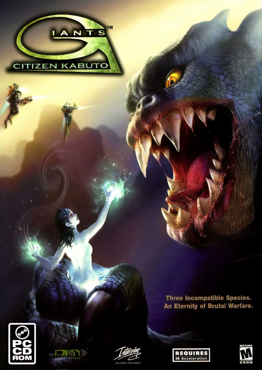 On a far away planet, three races fight for control of the few landmasses available: the marooned Meccs, who specialize in firearms and other things that go boom, the mystical and cold-blooded Reapers, who were the original inhabitants of the planet, but were forced to live in the sea by Kabuto, the third character; a truly gigantic monster with a ravenous appetite and a fondness for performing wrestling maneuvers on those the size of his hand. You can control any of these races (although in the single player mode, you have to progress through the storylines of the Meccs and Reapers first) in their bid to be the dominant species. Each species various in the way they play the game and have vastly different types of attacks available to them. Giants is a action/real-time-strategy game that emphasizes action. While there is base-building and resource management for most of the races, it is a done through a simple to control interface and one or two keystrokes. The majority of the game will be spent in a third person view (first person mode is available) jet-packing/warping/leaping about the well rendered 3D landscape. Single player sessions consist of missions with specific goals, such as resucing Smarties or recovering lost items. Multiplayer options include standard deathmatch, capture the Smartie (flag), the above with basebuilding as an option. Other creatures also inhabit the islands. From the meek Smarties (who are employed to build your bases or eaten as a primary source of protein, depending on your species), to the cow-like vimps to the deadly rippers, the fauna of the planet will either try to kill you or avoid being killed/eaten/captured. While not so energetic, the floral of the islands can be crushed, knocked over, or burned in careless combat (or by Kabuto not paying attention).
