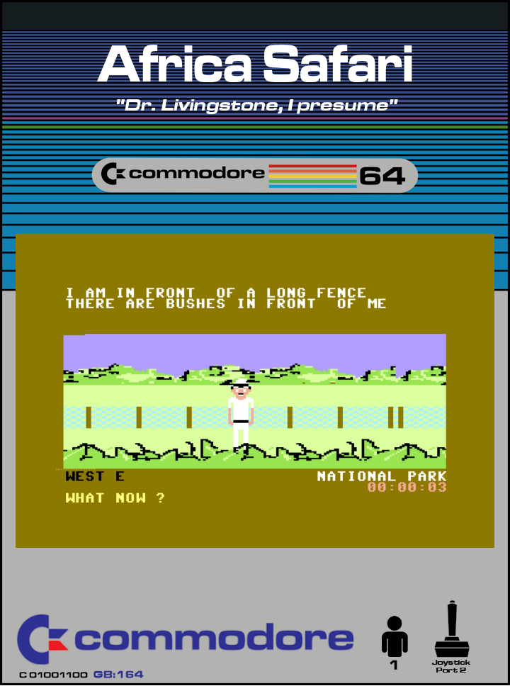 In African Safari, you play the role of Dr. Livingstone who must explore a national park near the Zambezi River. The game is an adventure in which you control Livingstone using a joystick and perform actions using the keyboard. You start the game with a bad back, and cannot lean over to pick things up, So you need to befriend wildlife, such as monkeys, so that they can pick things up for you.