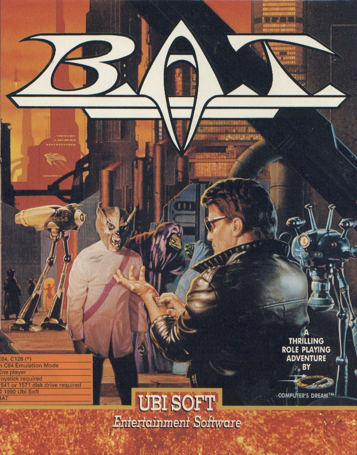 B.A.T. is cyberpunk romp through the underworld of crime and corruption. As agent for B.A.T. (Bureau of Astral Troubleshooters), an ultra-secret organization serving the Confederation of the Galaxies in the 22nd century, you will be assigned various missions covering a wide range of spy activities and planets. B.A.T. is a mixture of first-person adventure game and role-playing. Most of the game is spent exploring the futuristic locations, talking to characters and gathering items needed to advance the narrative. Combat occurs randomly and utilizes a real-time system: the player must prepare for the battle within a limited amount of time, after which the combatants exchange blows. The protagonist is able to side-step and dodge the attacks. Other features include the ability to program the B.O.B. (organic computer implanted on your arm), and RPG-style character development based on various stats.