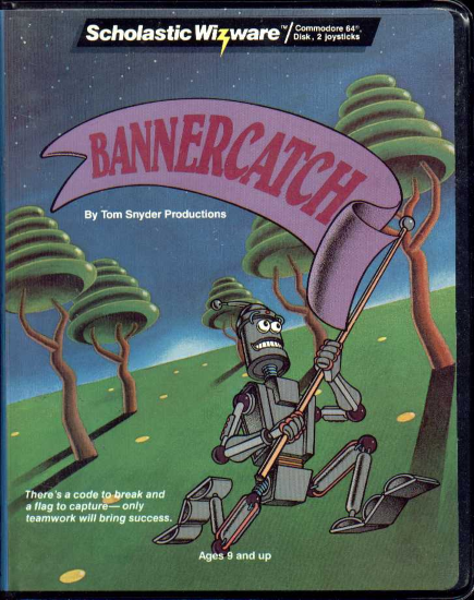 Bannercatch is an educational action game for two players. The game is a variation of capture the flag, two human players compete against Max and his team of robots. To win the game, the players need to work as a team to travel to Max's zone of the playfield, capture the flag, and bring it back safely back before Max is able to capture the players flag. Each time the players successfully capture one of Max's flags, part of his face will be revealed, the goal is to try to see all of Max's face. To help with this quest, the game includes maps which provide an overview of the entire playing field (each player will only be able to see a small portion on the screen at a time). Also, hints about his flags whereabouts can be gained by tricking Max into telling about it. This is done by positioning a player over one of the robot sensors and attempting to communicate with Max disguised as one of his robots. Since Max talks to his robots in binary, the player will need to translate a series of binary numbers to convince Max to reveal clues about his flags location. At any time during the game the player can freeze the action, this allows for checking the maps or taking a rest. The game features five different levels of difficulty along with a demonstration mode. Points are earned for successfully capturing the flag, tagging a robot which is carrying your flag, and winning the game.