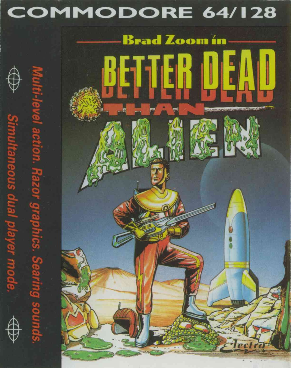 Brad Zoom takes on the Brain Eaters from the Purple Planet, in this homage to vintage action games, primarily Galaxians. There are 75 levels, accessed via passcodes. You control a spaceship at the bottom of the screen facing upwards, firing at arrangements of aliens. You can move up and down as well as left and right as you shoot them. At set intervals an alien will emerge from the main pack and sweep down towards you. Other levels feature Asteroids which split when shot, or a single ‘boss’ alien. Aliens with green eyeballs release power-ups, such as improved weapons, shields and bombs. You have a single life with which to survive the carnage. You get points for surviving as well as scoring, so slow but cautious play is more rewarding.