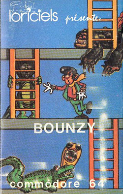 Bounzy represents a duel between a human (player) and reptiles (computer) set in the multi-staged spiral building shown in plane. The human should collect all the items in the building, moving between stages by ladders, to progress to next level. Meantime, the reptiles are running much faster than the human and move towards the level where human is located. There are different types of reptiles: some of them can't use the ladders, but others can. The human should avoid the contact with reptiles, because a confrontation is lethal. The building structure and positions of items and ladders are randomly generated at the start of each duel, regardless if the player lost a life or started the game from the very beginning. There are four kinds of items: keys, amphorae, statues, and gems. Each of them brings a different amount of points. The player's highest score based on collected points is written in the hi-scores table after the game. The player's character is controlled by the four directional keys assigned to letters or by joystick. The difficulty level can be adjusted.