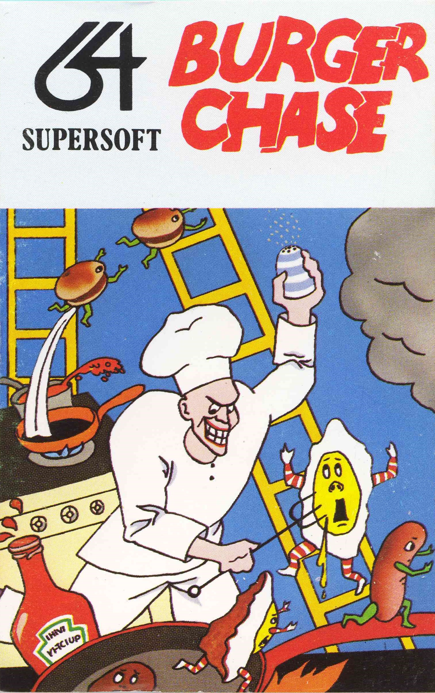 Burger Chase is a single screen platformer inspired by the arcade game BurgerTime where you are a chef who has to make four burgers over four levels. On each screen there are various levels with an ingredient and you have to run over each ingredient to push it down a level which will push down any ingredient below. You use ladders to climb up or down the various levels and the whole burger must be on the bottom of the screen for it to be completed. Moving around the screen are some rogue ingredients like eggs and sausages and these need avoiding as touching one will lose you one of three lives. You do have a limited amount of pepper which stuns them for a short time but you can kill them if you push a burger ingredient on top of them. Items appear on the screen and these can be collected for bonus points and extra pepper. Two players can play with each player taking it in turns when the other player has lost a life.