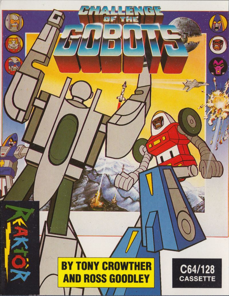 Challenge of the Gobots is a Defender variant based on the TV cartoon series of the same name (which is based on a toy line). The evil Dr. Braxis, with headquarter on the planet Moebius, wants to destroy earth and kidnapped some of their Gobot defenders and their human comrades. Now the player takes the role of Leader-1, the Gobot leader, to invade Moebius. Leader-1 transforms into his second form, a futuristic space ship, and goes on his way. There are two basic enemy forms to destroy: space ships are killed with the laser and earth-bound vehicles have to be destroyed by throwing rocks at them. Those are collected by landing and digging. The goal, however, is to destroy the enemy bases. To reach this goal, he needs to collect and use special bombs (clones of his sidekick Scooter) which are randomly divided over the planet. After finishing the mission the game loops with a higher difficulty, which can also be altered before starting a new game: the player can change factors like gravity or speed. The game also includes an electronic novel with the prologue and an audio cassette with the soundtrack.