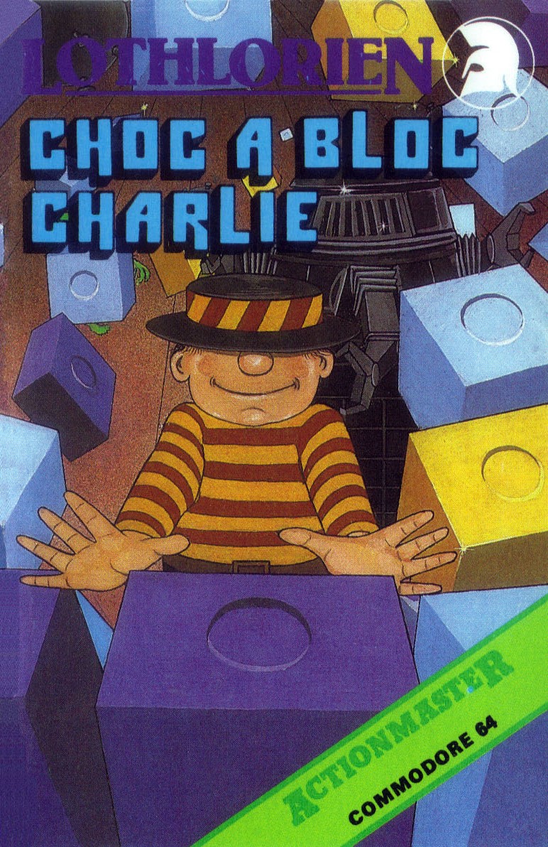 Choc A Bloc Charlie is a single screen game where you are Charlie and you have appeared in a warehouse from a time warp and it seems there is no escape. The warehouse is made up of many white blocks with four yellow blocks and four purple blocks which can be pushed around the screen. To escape from the screen you must put the four purple blocks together in a larger square to open an exit within a time limit and move on to another warehouses in which there are 16 in total. The yellow blocks when put together give you a points bonus. Moving around the screen is a creature that lays mines which after a few seconds explodes, and also there are guards behind each purple block and when released move around the screen. You are armed with unlimited grenades that don't harm the creature or guards but removes the white blocks. Careful use must be taken as throwing a grenade decreases an energy bar and being touched by the creature and guards also decreases it. Once your energy is empty or you run out of time then you lose one of five lives. When the exit has appeared you move to another screen where you must get from the left of the screen to the right avoiding spinning creatures or a life is lost. The next warehouse has the same layout but more creatures have appeared.