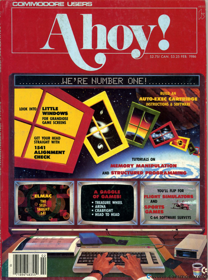 We've all heard of Gunfight at the O.K. Corral. Now there's a crabfight in the Commodore RAM. Two crabs, one red and one purple, are pitted against each other in a duel to reach 200 points. The game begins with a crab race. A clam is placed in the center of the playing area. The first crab to reach the clam takes possession of it. Each player must try to protect an octopus and at the same time attempt to eliminate the opponent's octopus by shooting the clam at it.