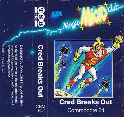 Cred Breaks Out was a game released in association with the British bank, TSB to encourage young people to join, and sees you playing the role of Cred as you attempt to rescue Interrestials from various prisons over four levels. The game is a single screen top view maze game and starting beside your ship on the top of the screen, you must move around the maze to open the door of the Interrestials' prison and lead them back to your ship. As you move around the maze, the prison guards called Ontick's also move around the maze trying to stop the escape. Once you touch a Interrestial or a group then they will follow you but if they touch a Ontick then they disperse. If you touch a Ontick then you lose one of three lives but the level starts again. To complete a level, all the Interrestials have to be rescued before an oxygen gauge empties and if it does then it is game over. Before the game starts you can select which level you want to start on.