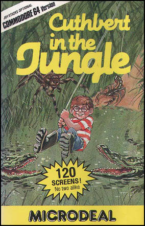 Trapfall, or as it is known on the Commodore 64 / Dragon 32, Cuthbert in the Jungle, is a direct clone of Activision's classic Pitfall. In a red, blue, yellow and green jungle, your hero (Cuthbert) must run through the landscape, avoiding falling into lakes (some of which appear out of nothing, only to disappear again), being crushed by rolling logs, being bit by snakes, scorpions or other dangerous creatures of the jungle. In the lakes live crocodiles, which can be used as stepping stones as long as their jaws are closed. In order to cross lakes, lianas may also be used, Tarzan-style. For some reason, there is a big cellar beneath the jungle into which Cuthbert may fall. It may be used as a way to avoid the dangers on the surface, but it is also inhabited by nasties, and you may run into a cul-de-sac. To spice things up, you only have 20 minutes to reach the end.
