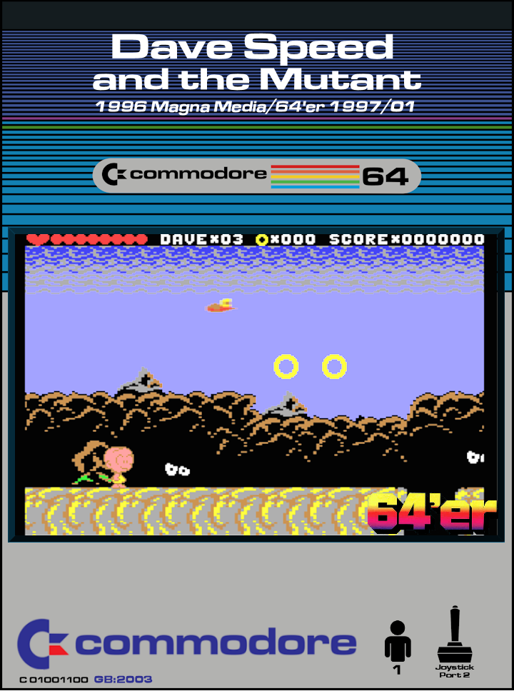 In this game, players controls Dave Speed who has decided to explore a strange land he was raised in. Creatures threaten to hurt Dave wherever he goes, but Dave can stomp on these creatures to destroy them. Eating chicken legs along the way will cause Dave to be angry, allowing him to destroy creatures by just walking into them. Some creatures will leave fruit behind when they are destroyed, and getting them will increase Dave's energy. There are rings scattered everywhere he goes, and collecting 100 of these rings results in an extra life. Published in 64'er 1997/01.