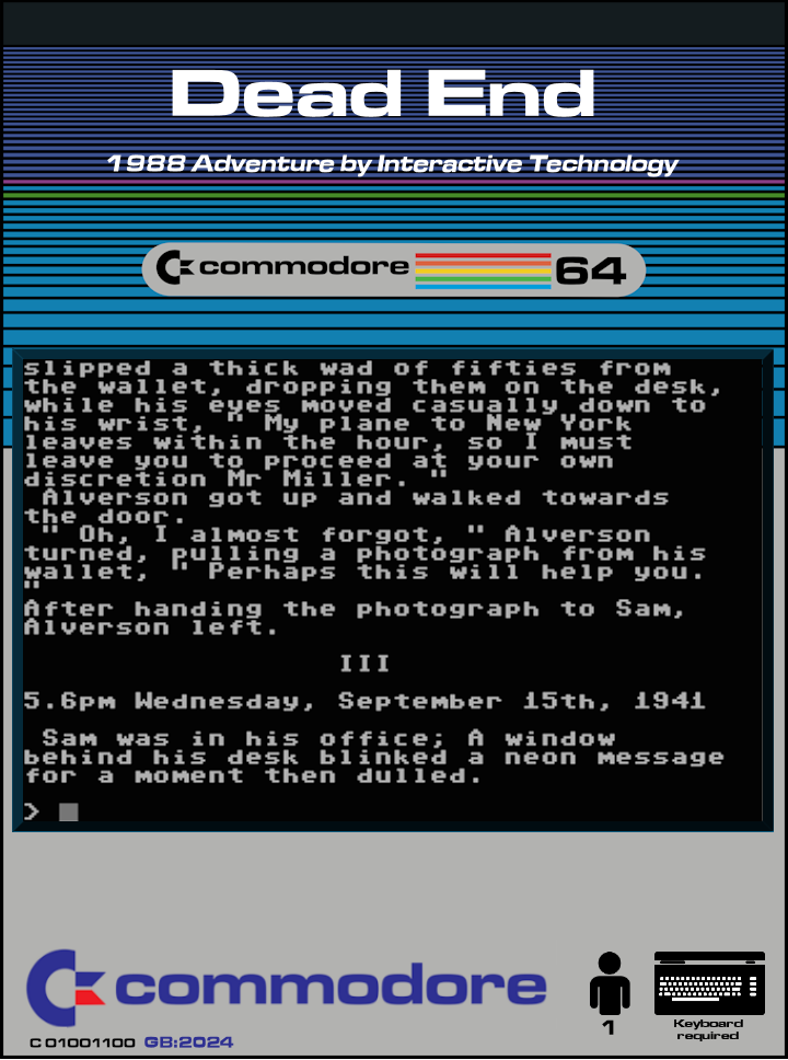 You are Sam Miller, a private eye and you have been hired to find out how Miles Dunbar was killed and who the killer is. You start the game being interrogated by a Police Lieutenant about the murder before the game switches to the day before and you play the game finding clues and talking to people as you try to find answers. The game ends when you are in front of the Lieutenant again giving the correct answers to his questions. Dead End is a graphic text adventure when the screen has text that describes your location, people and objects. Occasionally a picture will show you what you see of your current location and you type in commands with the keyboard to interact with each location.
