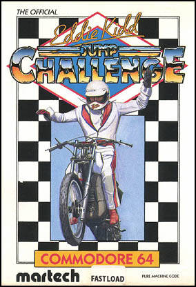 Eddie Kidd Jump Challenge is a 1985 vehicle simulation game released for the Commodore 64, MSX, ZX Spectrum, Acorn Electron and BBC Micro, licensed by British stunt performer, Eddie Kidd. Licensed around stunt legend Eddie Kidd, this game gives you the chance to recreate his death-defying feats. You start off attempting to jump oil barrels on a bicycle, with the bigger feats of jumping a motorbike over cars come later. You get no speedometer to help you judge speeds, but you can learn to gauge exactly how the bike handles and what it can do. You can position the start of your run-up, with wind needing to be factored in as an affect on the distance. Wheelies can be practices on the approach ramp. The further on you land, the better the score.