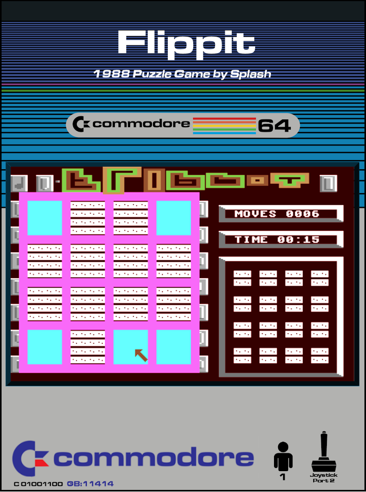 Flippit is a puzzle game where the player has to swap the colour of squares so the grid being played on matches the grid on the bottom right corner. When the player clicks on a square with the joystick it swaps colour and other squares round it. There are over a 100 levels to complete. Other things the player can see on the screen are how many moves he or she has taken and the timer. There is no time limit, but the faster and the fewer moves the player completes a grid with, the better the high-score.