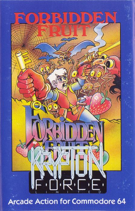 A freak storm has destroyed fruit farmer Fred's crop and the only solution from being ruined is to enter Castle Kadenza in Trasylvania and collect as much fruit as possible in the dark cellars. Forbidden Fruit is a top view single screen maze game where you move Fred around the screen collecting the fruit or just leave the fruit and exit each screen. Each fruit if collected is collected in order and you are told which fruit is next and when you want to leave the screen then a key must be collected before leaving by a locked door. Also on the screen are various creatures and monsters and these can be avoided or shot with your laser but you can only fire left or right. If you touch a creature or allow a timer to reach zero then you lose one of three lives.