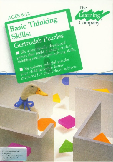 Gertrude's Puzzles, like its companion game Gertrude's Secrets, is an educational title featuring Gertrude the Goose, although it's intended for a (very slightly) older audience. Here, too, the player roams around an interconnected series of chambers, and (with Gertrude's aid) solves puzzles which exercise logic, pattern recognition and visual interpretation skills. The tour of Gertrude's residence begins with a tutorial, which introduces the concept of interacting with objects by using the cursor. The three types of puzzles are based on manipulating and sorting objects according to their shapes and colors: the Box Puzzles challenge the player to arrange objects on a grid, the Network Puzzles, on a relationship graph, and the Layout Puzzles, in a sort of Venn diagram. Solving each puzzle awards a random prize from Gertrude, and the prizes are collected for display in the Treasure Room. For variety's sake, the appearance of puzzle pieces can be altered by choosing from six predefined sets -- or by visiting the designated Shape Edit room, where players can create and modify custom pieces.