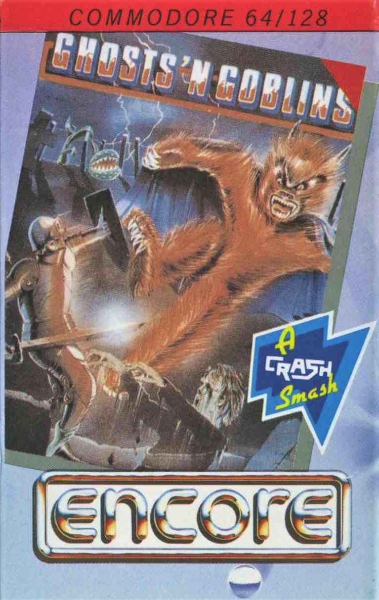Ghosts 'N Goblins is a sideways scrolling action platformer spread over six levels, each of which must be completed within three minutes (or a life is lost), taking in forest, village, mountain and cavern settings with increasing difficulty. Arthur the brave knight must rescue his beloved Princess from the Demon King Astaroth and his forces - amongst them are the various undead (ghosts, zombies), bats, ogres and goblins. Other challenges include moving platforms, ladders and water/fire hazards. The player can walk left and right, jump, and is also equipped with a lance to use as a weapon. Getting hit by enemies causes Arthur to lose his armor and run around in his underpants, getting hit again will cause the player to lose a life. As in most games in this genre, the player can pick up power-ups such as daggers and bombs during the course of the game, giving the player greater firepower.