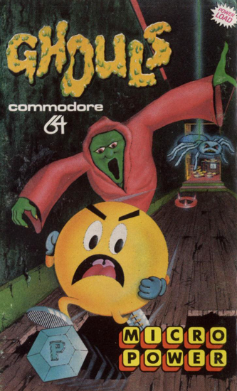 Ghouls is a single screen platform game where you have to control a creature and retrieve the power jewels taken by ghosts and stored in a haunted mansion. Starting on the bottom of the screen, you have to jump up and walk on platforms to get to your power jewels on the top of the screen. Some of the jewels have come loose and you can collect them as you move around the screen. Also on the screen are ghosts, spiders and various obstacles like spikes and moving platforms and if you touch a ghost, spike or fall from a certain height then you lose one of four lives. You can collect a special jewel which makes the ghosts disappear for a few seconds and springs allow you to jump higher. A timer counts down and a level must be completed within the time or you lose a life.