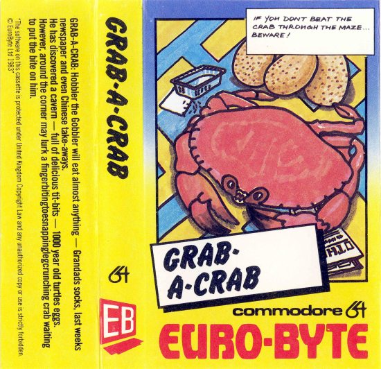 Grab-A-Crab is a top view single screen maze game inspired by the arcade game Pac-Man where you play the role of Hobbler the Gobbler who will eat anything. You have discovered a cavern with old turtle eggs and you plan to eat them all over various levels to fulfill your large appetite. As you eat the eggs around the maze, four crabs also move around the maze and have to be avoided or you lose one of three lives. There are four dodo eggs in each corner and if eaten allow you to eat the crabs for a short period of time. If you eat a lobster pot in the centre of the maze then you receive an extra dodo egg.