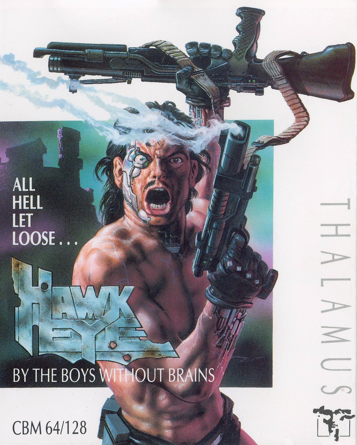 A bi-directional horizontally scrolling platform game, Hawkeye has the player in control of an SLF (Synthetic Life Form) controlled from an underground bunker by the Xamoxians. On each level, the eyes of the hawks in the status panel flash to indicate the direction to travel in to find a puzzle piece. Four pieces are needed to complete the level, but there were also other pickups such as ammo and energy. There were 12 levels to complete plus a hidden bonus level. The player has a choice of four different weapons. The basic pistol had unlimited ammo but did little damage. The machine gun had a faster rate of fire, the laser did more damage and most powerful of all was the rocket launcher - but all three soon ran out of ammo. The game features parallax scrolling backgrounds and large numbers of enemies (including large rhinos, triceratops and gorillas).