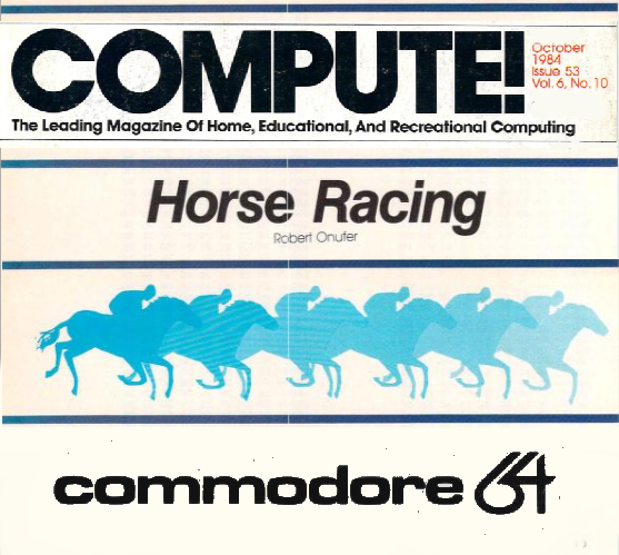 Published in COMPUTE! 1984/10 (Issue #53). Watch your favorite pony win (or lose) in this detailed, effective simulation of race-track betting.