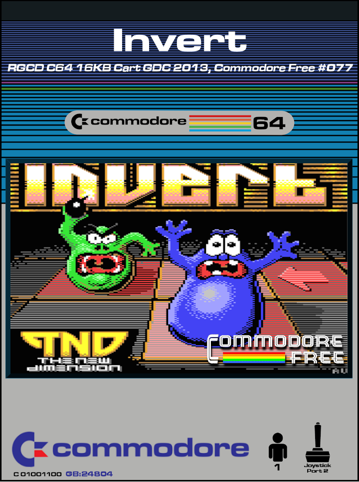 Released as part of the RGCD C64 16KB Cartridge Game Development Competition 2013 and also in Commodore Free #077. Featuring a fully built level editor for creating your own versions. in Invert, you are a Blob that has been kidnapped by a flying monster and thrown into a cell in Puzzle Land. In an attempt to escape from the cell, you must complete all 32 puzzles inside. All black, inverted tiles in the play area must be INVERTED back to their normal state within the time limit. This may sound simple enough, but you are not alone. Monsters (Chatters) are out to stop you from completing the puzzle. They run around the perimeter of the outer rim of the cell. At times they will feel like throwing bombs. So you must not only restore all inverted tiles, but do so while defending yourself from the Chatters. The tiles in the game vary on some levels. Read the up scroll for more information about these.