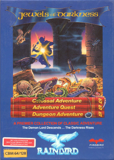 1986 saw the release of Jewels of Darkness on the Amiga system, a Text Adventure game with still pictures created by Level 9 and distributed by Firebird in USA and Rainbird in the rest of the world. Originally conceived in 1983 by Level 9 as the Middle-Earth trilogy, the standalone 8-bit releases of Colossal Adventure, Adventure Quest and Dungeon Adventure were enhanced and published in this renamed compilation Jewels of Darkness. The Amiga version is the update of the original text-only Middle Earth Trilogy. Jewels of Darkness enhances the original text-only incarnations released for 8-bit platforms by adding graphics, more extensive text descriptions, an extended parser that understands many more commands and other user-friendly features. The subsequent games in this trilogy are full of illogical puzzles and paper-thin plots, although Dungeon Adventure does add a D&D style magic system to make it more interesting. These games originally had references to Lords of the Ring novels that were later removed, possibly to avoid charges of copyright infringement.