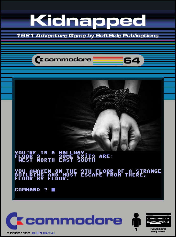 Want to impress your friends? There's no better way than to rescue them from the aliens who've locked them in an underground maze! You can accomplish this amazing task with Kidnapped! The problem is that you only have 2 minutes to save them all because once the aliens detect you the maze will be set to explode. The maze has 7 doors, six open into hiding places and the last, a black one, leading to the outside. Scattered throughout the maze are keys needed to open the doors. Don't touch the alien guards or they will capture you and all will be lost! Published in ReRun 1989/03-04.