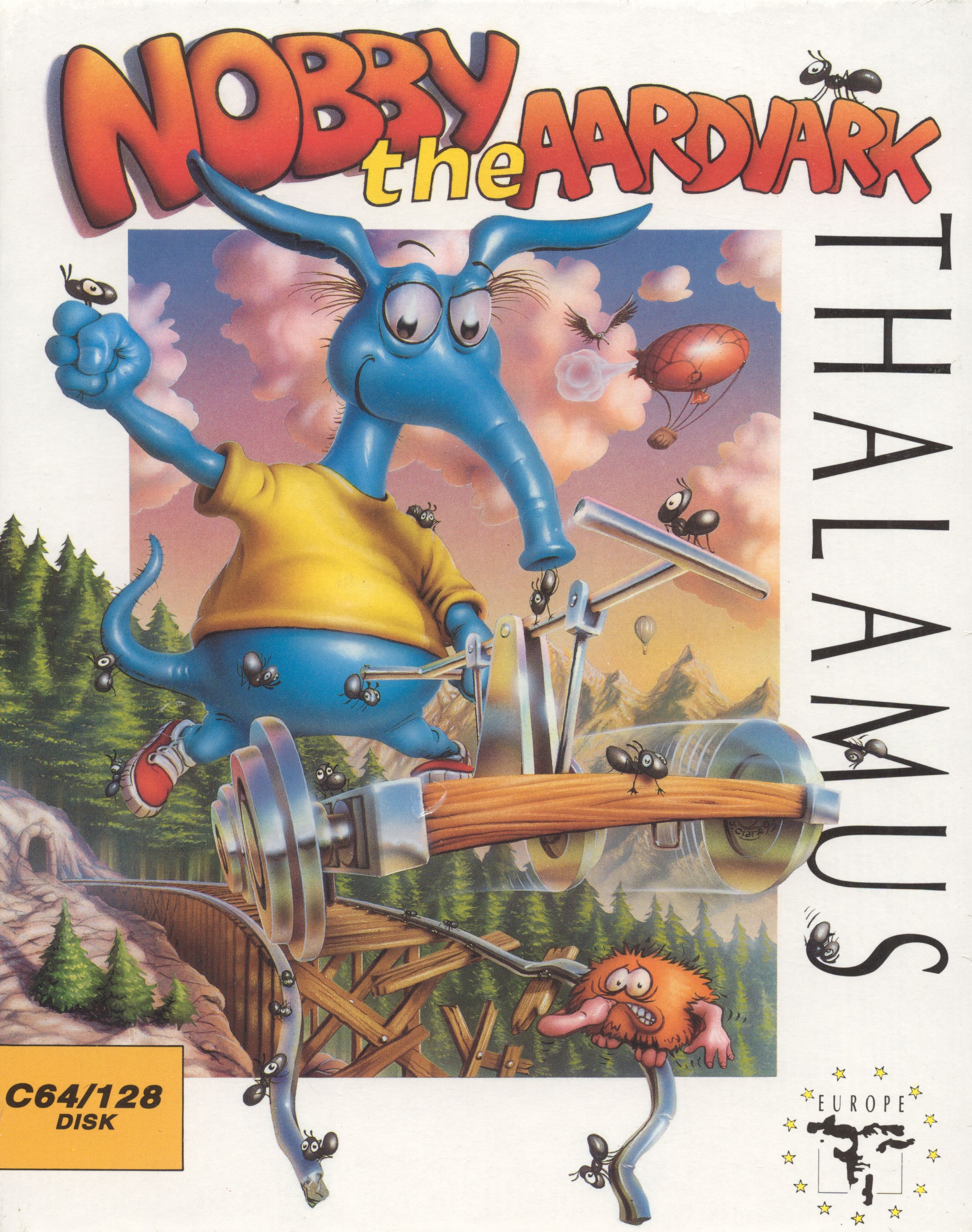 Nobby the Aardvark is a mixture of game styles that include platform, mulit-scrolling, and top down maze levels. Vehicles included are a hot air balloon and a submarine. The joystick is used to control Nobby and the fire button is used to fire objects. If Nobby runs out of ants to fire then he can top up at an anthill.