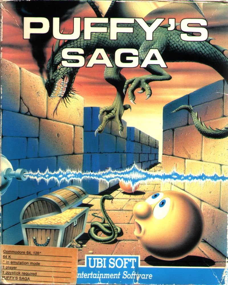 Puffy's Saga is an overhead view maze game that represents a cutesy variant of Gauntlet. Each of the 20 levels has a quota of dots to eat before the level is completed. These levels are inhabited by foes who surround you and reduce your energy on contact. Meat restores 100 energy points each time - this total can go beyond its starting level of 500. You are armed with a gun, which not only kills foes but also turns many of them into edible energy-giving snacks.