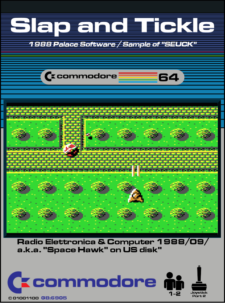 Slap 'n' Tickle (inspired by Slap Fight) was released as part of the Shoot-'Em-Up Construction Kit (SEUCK) and is a scrolling space shooter. Also released in Radio Elettronica & Computer magazine 1988/09.