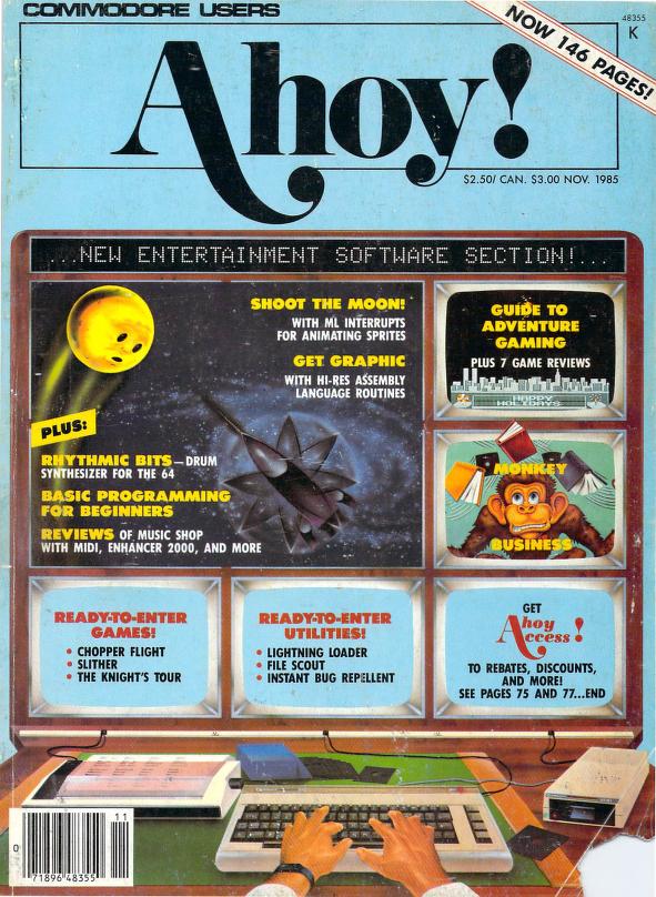 Published in Ahoy! 1985/11 (Issue #23). Got fast reflexes? Then Slither is for you. The object is to collect prizes from the 40 rooms of a deserted castle by maneuvering the snake and avoiding walls and the snake's tail, which grows continuously (use a joystick in port 2). Collide with either, and you lose a life (you start with seven). If you succeed in gulping down the prize, you move to the next screen, the screens get more difficult as you go along.