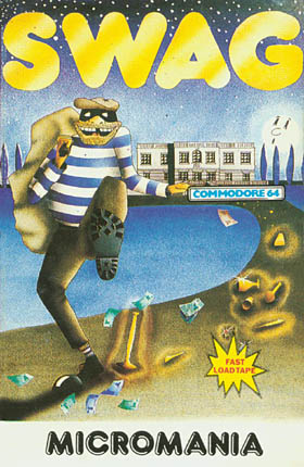 The SWAG MAN's on the job to burgle the millionaire's mansion. It is full of beautiful, valuable SWAG ready for nicking! Unfortunately, he's gate-crashed a fancy dress party and the guests are in pursuit. Help him collect the colored Master Code Cards which are hidden in the seemly never ending maze of rooms, to enable him to ESCAPE!