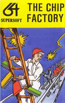 The Chip Factory is a single screen platform game based on the arcade game BurgerTime. You play the role of Charlie who is a trainee accountant in a Silicon Chip factory who dreams of working in the manufacturing section making the chips themselves. One night, when everyone has gone home, Charlie fires up the machines to try his hand at making the chips. To make the chips, Charlie has to move around the screen climbing up and down the ladders and walk over the chips to push them down a level and any chips below. The chips need to sit on a conveyor belt at the bottom of the screen in the right coloured order with a switch at the top of the screen moving the conveyor belt to the left. Problems have arisen though as various creatures move about the screen looking to disrupt the process buy either moving the conveyor belt using the switch or touching Charlie to lose him one of three lives. To prevent being touched, Charlie can either avoid the creatures or use anti-static spray which is limited to up to 19 squirts. Letters also appear which make up the word CHIP and when each letter is collected, it gives Charlie extra spray and when the word is made then it refills his spray. Two players can play and each one takes it in turns to play when the other player is killed.
