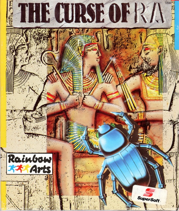 The Curse of RA is a puzzle game where the player (Scarab) has to escape a pyramid by solving the riddles. The player needs to remove all stones on a board by finding a counterpart. Only two stones with the same symbol can be removed at a time and they have to be on a straight line, horizontally or vertically. The game starts with Scarab on an ankh and that item has to be returned upon completion. Moving a stone is done by sitting on one and moving it towards the counterpart. Not all stones can be moved however and there are teleporters, obstructions and diversions to make it more difficult. There are also traps and for instance ice that forces Scarab to move in a single direction. When the stones are aligned, pressing fire matches them and they disappear. The game can be played in a Logic or in an Arcade mode. Logic mode offers 100 levels with no time limit. Special stones can make the player’s life easier or harder. In Arcade mode the player has to complete a level within a certain amount of time. Special coins can be used to buy extras after each level, such as ability to fly for 30 seconds, more time, extra lives and others. Levels are generated at random. The Arcade mode has a high score table. Demo mode shows the usage of all the different stones found in the game. This is a sort of non-playable tutorial. The game also provides a level editor.