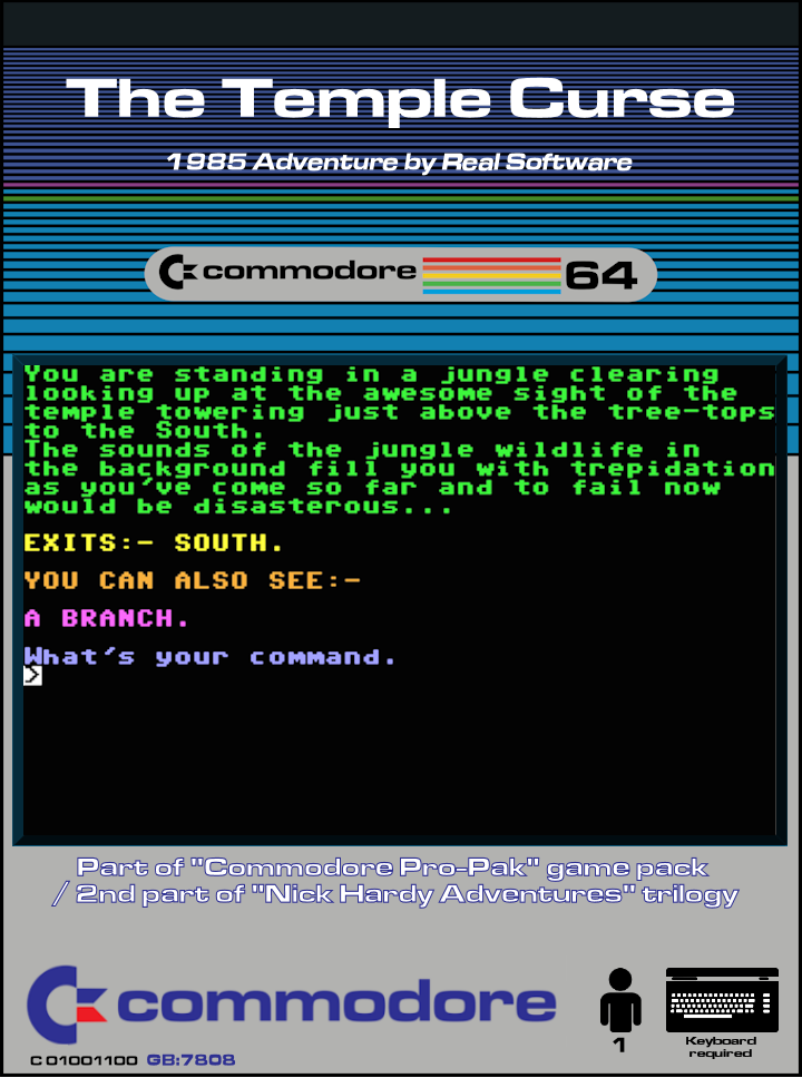 Released as part of "Commodore Pro-Pak" game pack and is the 2nd part of "Nick Hardy Adventures" trilogy. In the steaming tropics of South America, fearless Nick Hardy is hot on the trail of a hidden treasure that could make him (and the entire state of Michigan) very comfortable for life. He needs your help. But be careful - these Inca's don't mess around when it comes to curses!