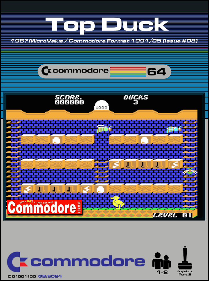 In this platform puzzler, your task is to guide our waddling wanderer round a series of platforms and ladders while avoiding the multitude of marauding meanies who are out to turn our courageous quacker into something hot that goes with noodles. Any contact at all will cost our feathered friend one of his meager three lives. To kill the baddies you must lure them under a platform and then peck one of the blocks above, which can fall on the baddies and crush their head. Squish, squish, squish! Blocks you peck become potential hazards later. Make your way to the mega dome and add a big fat nest egg of points to your totals.
