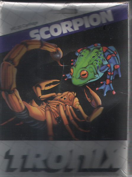 Scorpion is a shoot 'em up with multi dimensional scrolling where the hero is a venomous scorpion searching for tasty frog eggs.You are required to move the scorpion through an insect and vermin riddled maze in his search. You will need to avoid predators like dragons, worms and Venus flytraps, and deadly mama and baby 'pod creatures'. The speed of your scorpion is better than most of your enemies, and the nasty stinger blast you have at your disposal is a rude shock to those after you, killing most instantly. These predators cluster around the target of your hunger, the frog eggs, and your stinger will often destroy the eggs you seek while you combat the vermin attacking you. These eggs are worth 3200 points each, and in the lowest levels you earn bonus scorpions by scoring 4000 points. You must bring back all four eggs before they hatch into crazed killer frogs which charge you with the intention of biting off your head. The best response is to stay clear of a frog until you have built up enough power in your stinger to immobilize him, then carry him back to your lair. There are 32 levels of increasingly quicker and more deadly vermin, and complexity of mazes.