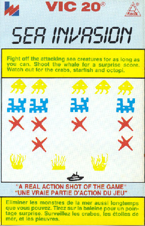 Sea Invasion is a Space Invaders variant set in the ocean. The player is a scuba diver who while down on the sea bed is being attacked by different sea creatures. The player moves left and right along the sea bed and has use his spear gun to shoot at the creatures above him while watching out for their projectiles. Some protection can be had from corals but these will disappear as they are hit by projectiles. There are three different sea creatures, octopi, crabs and starfish and the player gets points based on the position of each. Octopi are farthest away from the player and are therefore worth the most points. At times a shark swims across the surface and the player can get a bonus score for shooting it. The game is endless, when all creatures has been killed it all starts over with a new level until the player has lost all his lives.