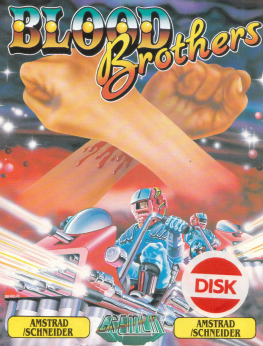 Blood Brothers is a combination of two games, a platform and flying game. The platform section is flick screen where you must avoid obstacles and shoot the baddies. The flying section sees you behind the Jet Bike flying into the screen. You must fly into the gaps in the walls looking for mine sections. You can't control the speed of the bike. You and a friend can control one of the brothers or you can control both by switching between the two. One brother is controlled by a joystick and the other by the keyboard.
