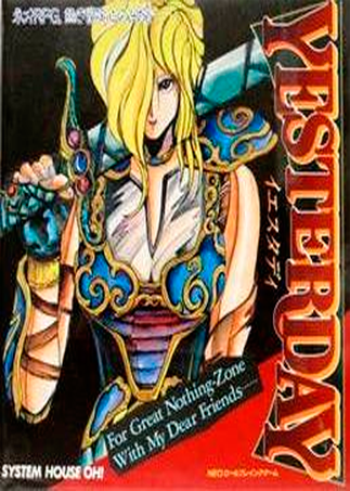 In the far future, human beings learned to travel to faraway solar systems, as a result, human civilization has spread across the entire galaxy. However, as they tried to explore the outer space beyond it, they encountered a huge black hole. It was said that a strange light emanated from it. A brave scientist and pilot named Sonya traveled to the black hole, and discovered a medieval-like world, whose inhabitants consider her a divine savior... Despite the side-scrolling perspective for navigation, Yesterday is an RPG without any action elements, similar to its "sister games" Caroll and Emerald Densetsu. The player navigates the heroine through vast side-scrolling environment, fighting randomly appearing enemies. During the turn-based battles, the game switches to first-person view. Items and equipment can be bought in friendly areas. Leveling up is automatic, magic spells are learned depending on the protagonist's level.