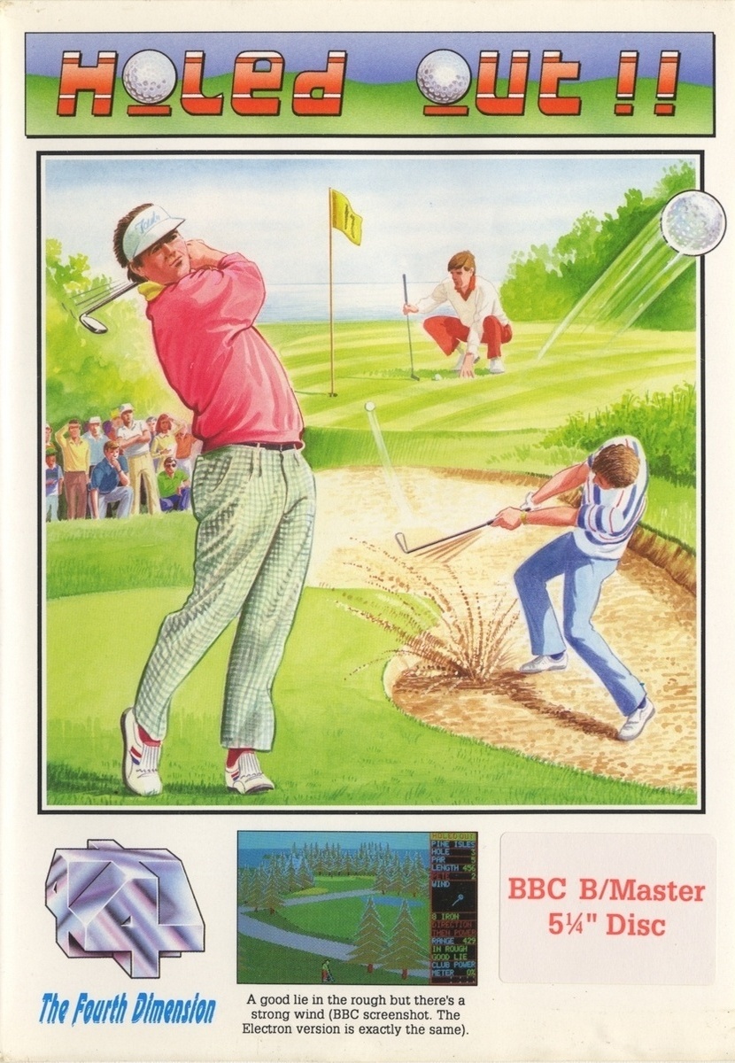 Holed Out!! is a golfing simulator programmed by Gordon J Key and published by The Fourth Dimension, aka The 4th Dimension (formerly Impact Software). It features two courses: Cone Links and Pine Isles. You can indulge in either strokeplay or matchplay. The idea with the former is to finish all 18 holes in the least number of strokes, while in matchplay the winner is the player who wins most holes. Up to four players can take part with each selecting one of four skill levels from beginner to professional. The one selected dictates whether the physical hazards or wind strength and direction influence your play. For instance, as a beginner only the water will affect your shot, whereas as a professional you could be playing from a bad lie in deep rough into a strong headwind. For all shots up to the green your view is from behind the golfer you control. On the right side of the screen is an information panel displaying details relevant to the hole. You select a club from a range of three woods, nine irons, a pitching wedge and a putter. A pair of standalone expansion packs were also released: Extra Courses Vol 1 featuring Glen Aigre and Eagle Park, and Vol 2 which comprised Dune Royal and Owlet Wood.