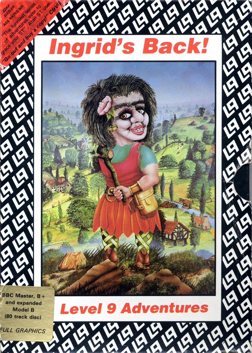 Gnome Ranger II: Ingrid's Back! (known as just Ingrid's Back! on the game box cover) is a text adventure game by Level 9 and the sequel to Gnome Ranger. A 3rd game to be called Gnome Ranger III: Gnome Free (or just Gnome Free) was written and designed, but was never programmed and released. Ingrid is Ingrid Bottomlow, the intellectual-but-clumsy gnome we met in Gnome Ranger. Her beloved home village Little Moaning is earmarked for a yuppie-friendly transformation by Jasper Quickbuck of Ridley's Manor. Ingrid has three cunning plans to stop him - producing a petition with everybody's signature, finding a more orthodox prevention method, and finally infiltrating Ridley's Manor itself by pretending to be a maid, and then finding proof that he's a dodgy geezer who should be locked up. These three quests can be played in any order, although they logically follow on from each other. She is accompanied by Flopsy the dog in the first 2 parts, and her cousin Daisy in the third. Ingrid's Back! uses the same game system as the original, and other contemporary Level 9 titles such as Knight Orc . Giving instructions to other characters (including Flopsy) and jumping around the map using GO TO and FOLLOW commands. A living and breathing world of people travelling, trading and relaxing underpins it all, and plays a part in most puzzles. The disk versions of the game contain graphics, the exception being the ports for Apple II and Atari 8-bit, which are text-only.