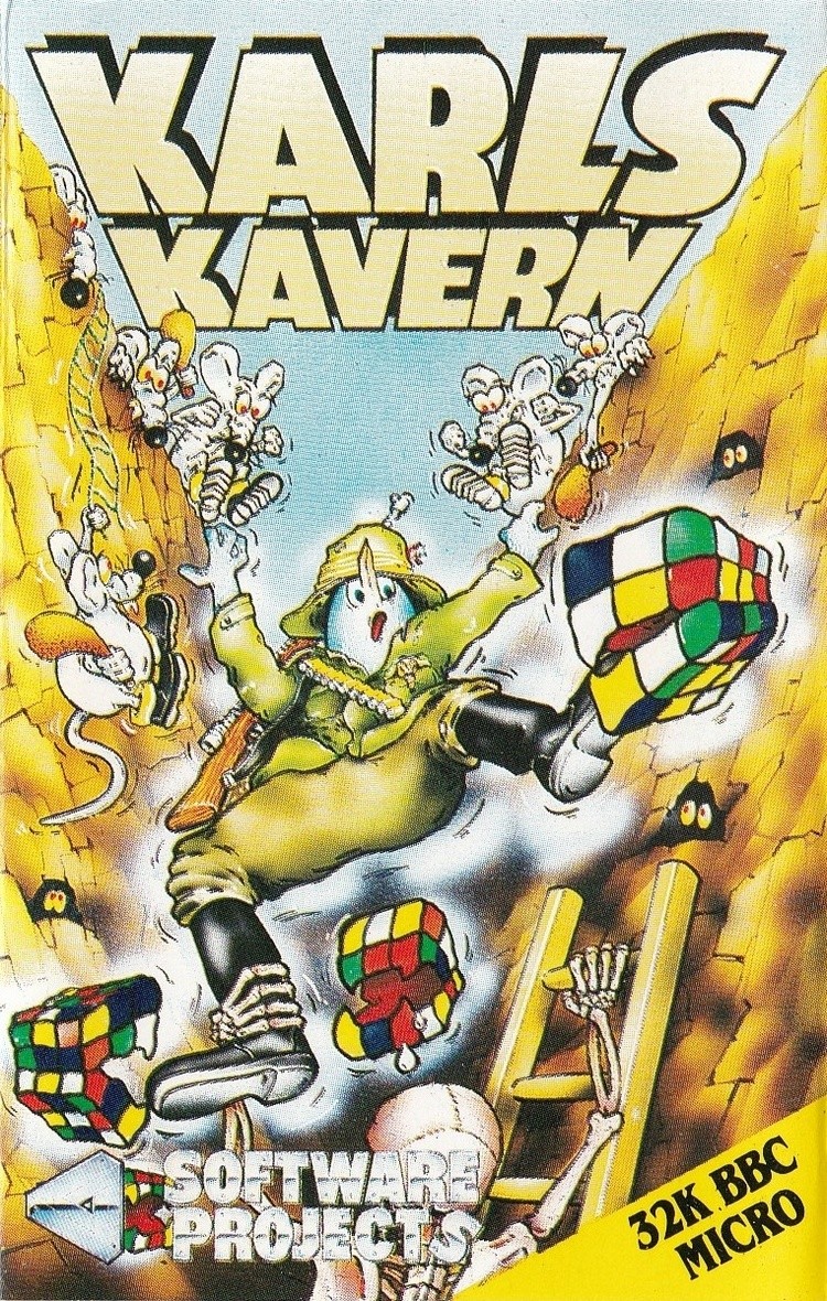 This game is titled Karls Kavern on it's box but referred to in-game as Karl's Cavern. Karls Kavern is a platformer in the style of Manic Miner. It consists of thirty single screen levels where the objective in each is to simply collect all the boxes that lie scattered around. To do it, the player has to jump between platforms (including moving ones) and avoid getting touched by any of the dangers that exist in the underground. Any contact will lead to a loss of life and so will a long fall. Levels also have collapsing platforms and conveyor belts. The player has five lives and when they are all used up the game ends. In addition to playing all the levels in sequence there is also a practice mode that allows the player to try out all the levels except the last one.